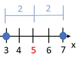 |x–5| = 2 ⇔ (x = 3 v x = 7), czyli x ⋲ {3, 7}.