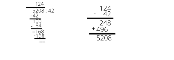 W pierwszej kolejności musisz wykonać działanie 5208 : 42 = 124. Następnie otrzymany wynik sprawdzić za pomocą mnożenie, czyli wykonać 124 ∙ 42 = 5208.