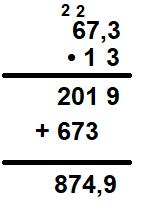 Zapisz mnożone liczby pod sobą. Wykonaj mnożenie pisemne jak na liczbach całkowitych. Wynik będzie zawierał tyle liczb po przecinku, ile razem mają oba czynniki mnożenia. Wpisz przecinek w odpowiednim miejscu.