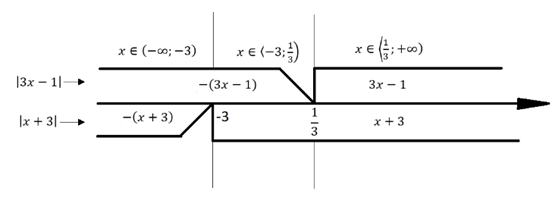 Rozważamy trzy przypadki, w których zapisujemy równanie bez symbolu wartości bezwzględnej. Rozwiązujemy je i sprawdzamy, czy otrzymana liczba zawiera w przedziale: