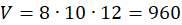 Oblicz objętość graniastosłupa o wymiarach 8 x 10 x 12 (iloczyn pola jego podstawy przez wysokość):