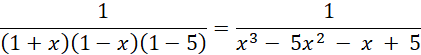 Skoro z dziedziny wypadają ci liczby -1, 1 oraz 5, to wybierasz wielomian trzeciego stopnia w mianowniku tego ułamka, dla którego -1, 1 i 5 są miejscami zerowymi. Najprostszy taki wielomian to