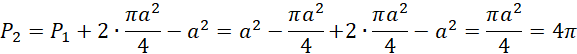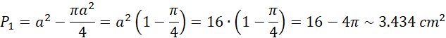 Jest to złożone zadanie i musisz zauważyć, że pierwszorzędnie należy obliczyć pole w kwadracie, które nie należy do połówek koła. Ten wycinek pola następnie sumujemy z polami połówek koła i otrzymujemy wartość całego kwadratu powiększoną o część wspólną tych połówek kół. Musisz więc odjąć od tego pole kwadratu, aby otrzymać pole zaznaczonej przestrzeni.