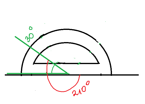Kąt 210º można przedstawić jako kąt 180º oraz kąt 30º