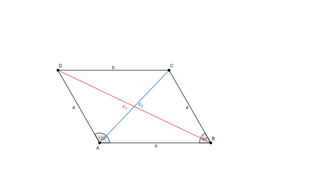 W tym zadaniu musisz oblicz długości przekątnych w równoległoboku, jeśli dane są długości a = 6 i b= 8 dwóch sąsiednich boków równoległoboku oraz kąt zawarty między tymi bokami wynosi γ = 120°.