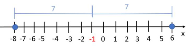 Należy znaleźć na osi liczbowej wszystkie liczby x, których odległość od liczby–1 jest większa bądź równa 7. Kolorem niebieskim zaznaczono zbiór rozwiązań nierówności, gdzie x Î (–∞,–8> ∪ <6, + ∞).