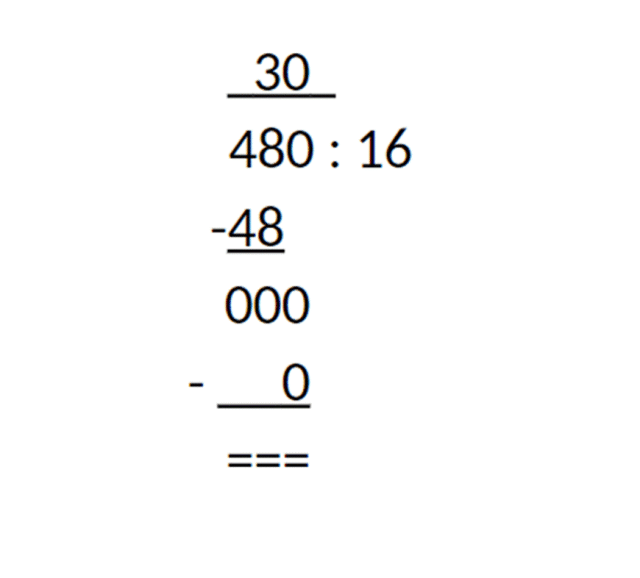 Na początek przesuń przecinki w liczbach o taką samą liczbę cyfr, aby dzielnik nie posiadał miejsc po przecinku. Następnie dzielną i dzielnik zapisz obok siebie, a wynik zapisuj nad dzielną. Wpisz na górze, ile razy w 48 mieści się pełna liczba 16. Następnie od 48 odejmij iloczyn 16 i wpisanej wcześniej liczby. Do wyniku odejmowania dopisz następną cyfrę dzielnej i działań identycznie, jak w poprzednim kroku, aż dojdziesz do końca dzielnej.