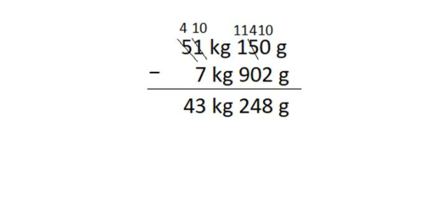 W tym zadaniu musisz wykonać odejmowanie podanego działania: 51 kg 150 g – 7 kg 902 g.