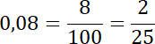 Pamiętaj, dwa miejsca po przecinku w ułamku dziesiętnym oznaczają, że w mianowniku ułamka znajduje się 100, a w liczniku – liczba po przecinku. Skróć ułamek przez 4.