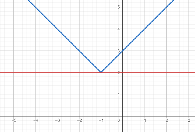 Naszkicuj wykres funkcji y = |2 + |x – 1|| – kolor niebieski oraz y = 2 – kolor czerwony. Rozwiązaniem są argumenty, dla których wykres niebieski znajduje się ponad wykresem czerwonym.