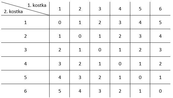 W tym zadaniu musisz określić dla jakiej różnicy (liczonej przez odjęcie od większej ilości oczek, mniejszej ilości) wyrzuconych kostek jest największa szansa jej wystąpienia.