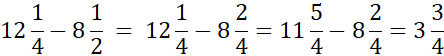 Rozszerz ułamki do mianownika 4 i wykonaj odejmowanie. Liczby całkowite znajdujące się przed ułamkami odejmij od siebie niezależnie od ułamków.