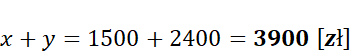 Oznacz przez x wypłatę pierwszego robotnika, a przez y – wypłatę drugiej osoby, która wynosi 2400 zł. Ułóż równanie, do którego wstaw daną y i wyznacz niewiadomą x. Następnie oblicz ich sumę.