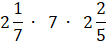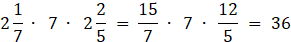 Przedstaw liczby mieszane jako ułamki, a następnie skróć ze sobą siódemki oraz 15 z 5 na krzyż dzieląc przez 5.
