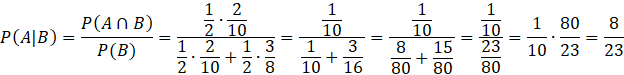Zauważ, że są dwie urny, więc prawdopodobieństwo wylosowania każdej z urn wynosi