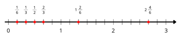 Rozpocznij od narysowania osi i odmierzenia odcinków o 3 cm. Następnie podziel odcinki na tyle części ile jest równy najwyższy mianownik podanych liczb. Zamień ułamki tak, by miały w mianowniku tę samą liczbę i oznacz je na osi.
