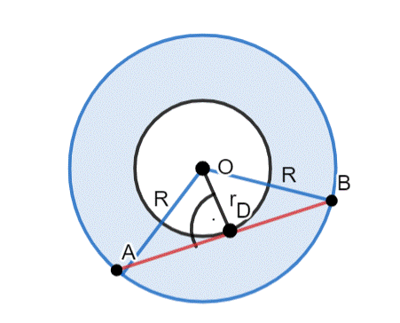 Na początku skonstruuj rysunek poglądowy i zaznacz na nim promienie okręgów. Skorzystaj z równania na promie pierścienia kołowego, aby wyznaczyć różnice kwadratów promieni pierścienia. Zauważ, że długość cięciwy, stycznej do mniejszego okręgu, możesz wyznaczyć z twierdzenia Pitagorasa. Wykorzystaj różnicę kwadratów promieni i wyznacz długość cięciwy |AB|.