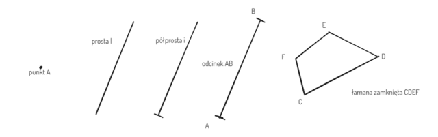 W tym zadaniu musisz narysować figury geometryczne: punkt, prostą, półprostą, odcinek i łamaną zamkniętą. Na koniec podpisz je literami.
