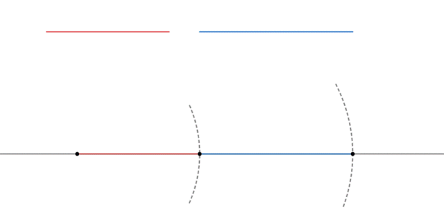 Najpierw za pomocą linijki narysuj dowolne dwa odcinki – nie zwracaj uwagę na wartości na podziałce, nie będą nam potrzebne. Następnie w innym miejscu narysuj fragment prostej i na niej zaznacz w dowolnym miejscu punkt – w tym miejscu zacznie się odcinek. Teraz cyrklem odmierz długość pierwszego narysowanego odcinka – jedną nóżkę przyłóż do jednego końca, a drugą – do drugiego końca odcinka. Nie zmieniając wymiarów na cyrklu, wbij ostro zakończony koniec w miejsce punktu na prostej, a następnie rysikiem zatocz łuk. Łuk przetnie się w jednym miejscu z prostą, w tym miejscu znajduje się drugi koniec pierwszego odcinka. Dokładnie tutaj wbij cyrkiel, na którym wcześniej odmierz długość drugiego odcinka. Ponownie zatocz łuk – miejsce przecięcia się łuku (oba łuki muszą być zwrócone w tę samą stronę) to koniec drugiego odcinka, czyli także koniec odcinka składającego się z dwóch fragmentów.