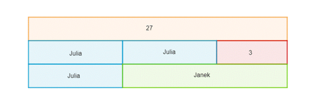 1) zilustruj sobie sumę lat dzieci – jest równa odcinkowi 27, a jednocześnie taką samą długość ma odcinek składający się podwojonego wieku Julii i 3 lat (bo mniejsza Julia + 3 = Janek), teraz widzisz, po skróceniu obu odcinków, dostaniesz sumę dwóch „Julek”, która jest równa 24, co pozwala wyliczyć, że Julia ma 12 lat, a Janek – 15.