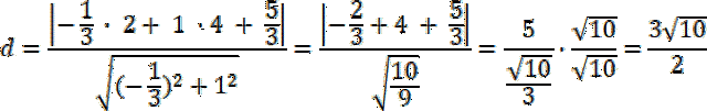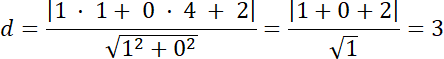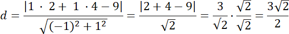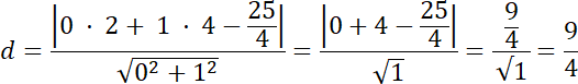 . Korzystając ze wzoru na odległość punktu A(x0, y0) od prostej o równaniu ogólnym: Ax + By + C = 0, który wyraża się za pomocą wzoru: