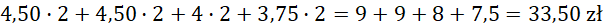 Ceny biletów podane w tabeli obejmują wejścia 30-minutowe. Rodzina była na basenie przez jedną godzinę, a więc musisz cenę każdego biletu pomnożyć razy 2. Liczysz ceny biletów obowiązujące w sobotę i niedzielę. Rodzice zaliczają się do kategorii dorośli, dziecko w wieku 13 lat do kategorii Młodzież 12-18 lat, dziecko w wieku 9 lat do kategorii Dzieci 6-11 lat. Dziecko, które ma 5 lat, wchodzi na basen za darmo.