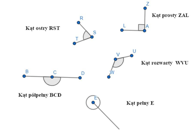 Narysuj 5 kątów: ostry, prosty, rozwarty, półpełny i wklęsły, a następnie nazwij wierzchołki punktów na ich ramionach. Pamiętaj, żeby podpisać wszystkie kąty.