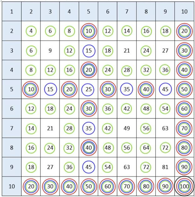 Liczby podzielne przez 2, to wszystkie liczby parzyste, czyli których cyfrą jedności jest cyfra parzysta (0, 2, 4, 6 lub 8). Liczby podzielne przez 5 mają na końcu cyfrę jedności 5 lub 0, podzielne przez 10 – na końcu mają cyfrę jedności 0. Natomiast w tabelce jest tylko jedna liczba podzielna przez 100 – musi mieć dwa zera na końcu.