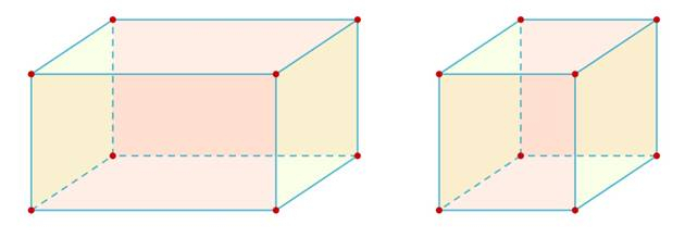 Na dwóch prostopadłościanach na rysunku pomaluj wierzchołki na czerwono, krawędzie na niebiesko, na bocznych ścianach – na jednej parze ścian równoległych narysuj rybki, a na drugiej – kwiatki.