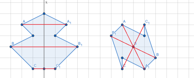 w pierwszej figurze to odbicia względem osi symetrii punktów A, B, C. Możesz odnaleźć tu analogię do odbić lustrzanych. Oś symetrii podzieliła odcinki na połowy.