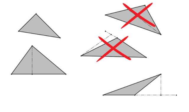 W skreślonych trójkątach wysokość opadała pod innym kątem niż 90°.