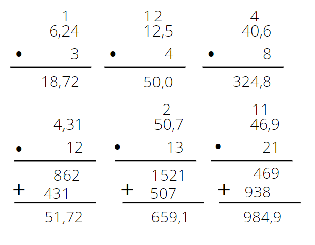 Najpierw mnożysz część dziesiętną czynnika przez liczbę górną, następnie mnożysz przez część jedności. Wynik pierwszego mnożenia wpisujesz dokładnie pod kreską, wynik drugiego mnożenia poprzedzasz liczbą zero/ nie wpisujesz nic. Następnie wykonujesz dodawanie.