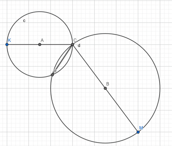 W tym zadaniu musisz narysować odpowiednie 2 okręgi, a potem ich wspólną cięciwę (prostą przechodzącą przez punkty, w których okręgi przecinają się).