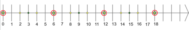 Zaznacz na osi liczbowej liczby podzielne przez 2 kolorem żółtym, zielonym liczby podzielne przez 3, a czerwonym liczby podzielne przez 6.