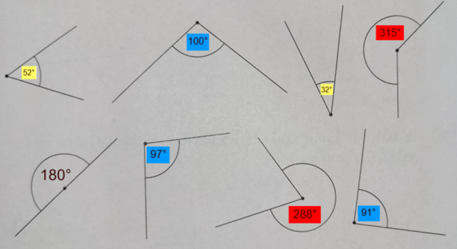 Zaznacz na żółto wnętrza kątów ostrych, na niebiesko kątów rozwartych i na czerwono – kątów wklęsłych.