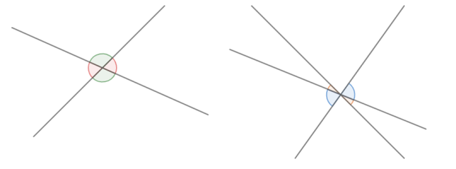 Narysuj dwie pary kątów wierzchołkowych na każdym rysunku i napisz, ile widzisz par kątów wierzchołkowych, które nie zostały pokolorowane na drugim rysunku.