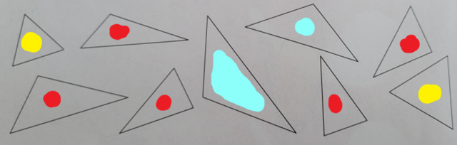 Zamaluj trójkąty równoboczne na żółto, trójkąty tylko z dwoma bokami równymi na niebiesko, a resztę trójkątów na czerwono. Napisz nazwę trójkątów czerwonych.