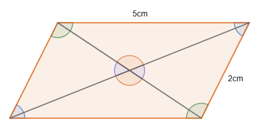 Naszkicuj równoległobok o bokach równych 2cm i 5cm. Zaznacz tymi samymi kolorami pary równych kątów. Następnie narysuj przekątne figury i zaznacz łukami w tym samym kolorze pary katów wierzchołkowych.