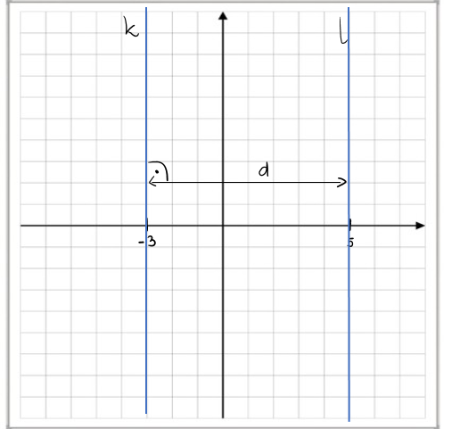 Narysuj układ współrzędnych i umieść na nim dwie proste: k i l. Następnie zaznacz odległość między nimi, pod kątem prostym, i ją oblicz.
