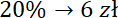 Cena przed podwyżką jest 5 razy większa od podanej kwoty, bo 20% razy 5 daje 100%. Pomnóż podaną kwotę przez tę liczbę – otrzymasz cenę bez podwyżki. Obecną cenę obliczysz, dodając do wcześniejszego wyniku podaną w treści podwyżkę.