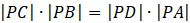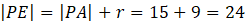 E—punkt przecięcia prostej i okręgu znajdujący się dalej punktu P
