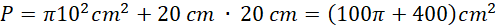 Pole okna to pole koła o promieniu r = 10 cm i pole kwadratu o boku 20 cm: