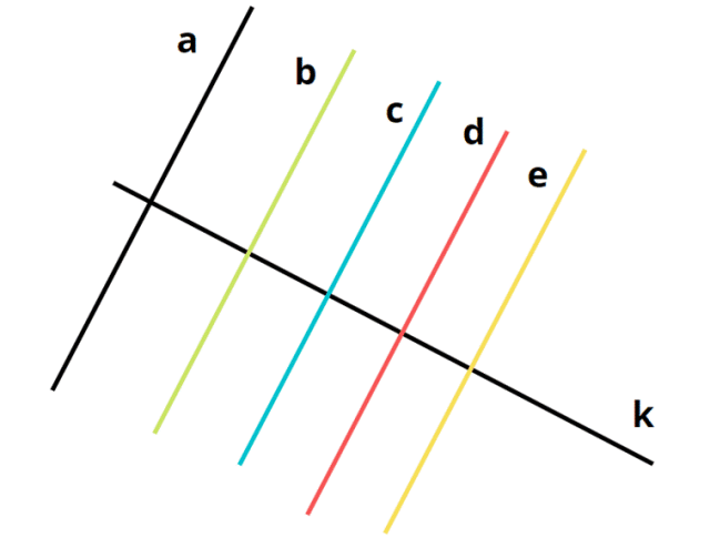 W pierwszej kolejności musisz stworzyć cztery nowe proste, które będą przecinały się z prostą k pod kątem prostym. Następnie musisz stworzyć odpowiednie zapisy.