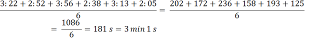 Zsumuj czasy piosenek i podziel przez ich ilość. Pamiętaj, aby działać na jednakowej jednostce – zamień podane czasy na sekundy – 1 min = 60 s