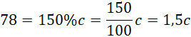 Liczba 78 stanowi 150% liczby c. Wtedy liczba c jest równa