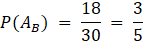 Spośród grupy osób znającej angielski, czyli 30 osób, chcesz wybrać osobę znającą niemiecki, a takich osób jest 18. Podziel te wartości, aby otrzymać prawdopodobieństwo