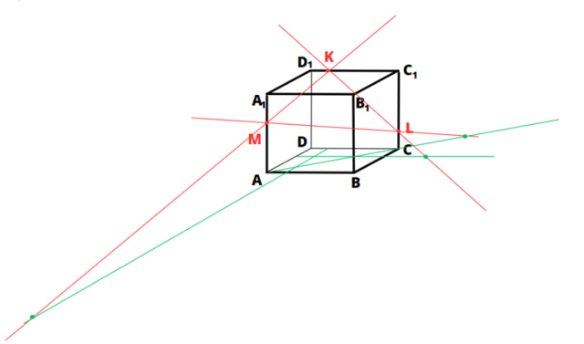 W tym zadaniu musisz przerysować rysunek (sześcianu ABCDA1B1C1D1oraz punktów K, L, M, które leżą odpowiednio na prostych C1D1, CC1, AA1) i wyznaczyć punkty przecięcia prostych KL, ML, MK z płaszczyzną (ABC).