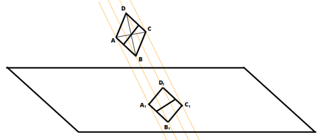 Narysuj romb ABCD, jego rzut na płaszczyznę i zaznacz wysokości. Punktem symetrii rombu jest punkt przecięcia jego przekątnych. Przykładowo rysunek może wyglądać tak: