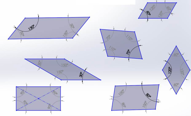 Równoległobok ma dwie pary takich samych kątów przeciwległych. W każdym równoległoboku suma miar kątów leżących przy tym samym boku wynosi 180°.