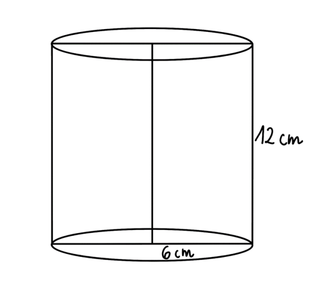 Wysokość walca to dłuższy bok kwadratu, czyli 12 cm, a promień podstawy to połowa boku kwadratu, czyli 6 cm.